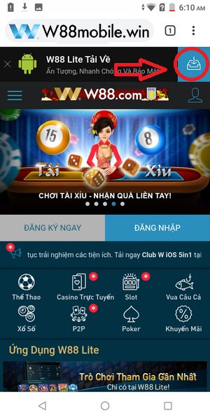 Bước 4: Sau khi chọn W88 Lite, bạn sẽ thấy một nút hoặc liên kết “TẢI VỀ”. Hãy chọn nó để bắt đầu quá trình tải file APK của ứng dụng W88 Lite về thiết bị Android của bạn.