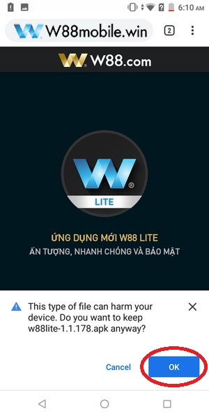 Chọn “OK” để bắt đầu quá trình tải app w88
