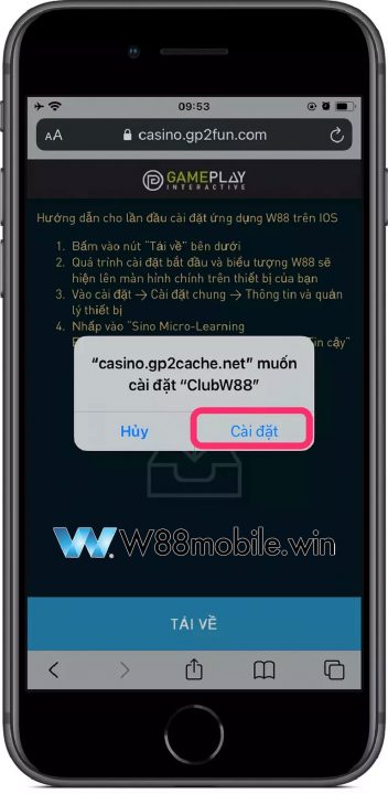 Chọn “CÀI ĐẶT” để tiếp tục tải app W88